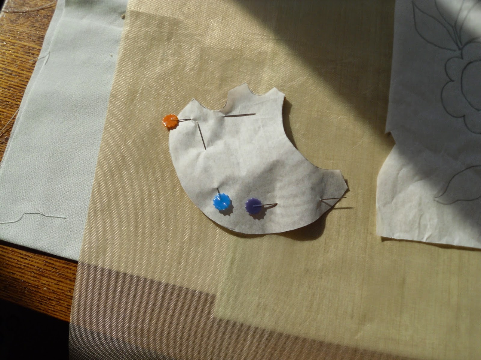 Вот здесь видно, что глаза располагаются сверху коричневой и бежевой ткани. Все припуски на этих тканях они (глаза) перекрыли- приклеились к ним.Мелкие детали помогает правильно расположить крупная булавка...Еще она вам поможет приподнять край верхней детали и подсунуть под нее припуск нижней( видно на крыле).